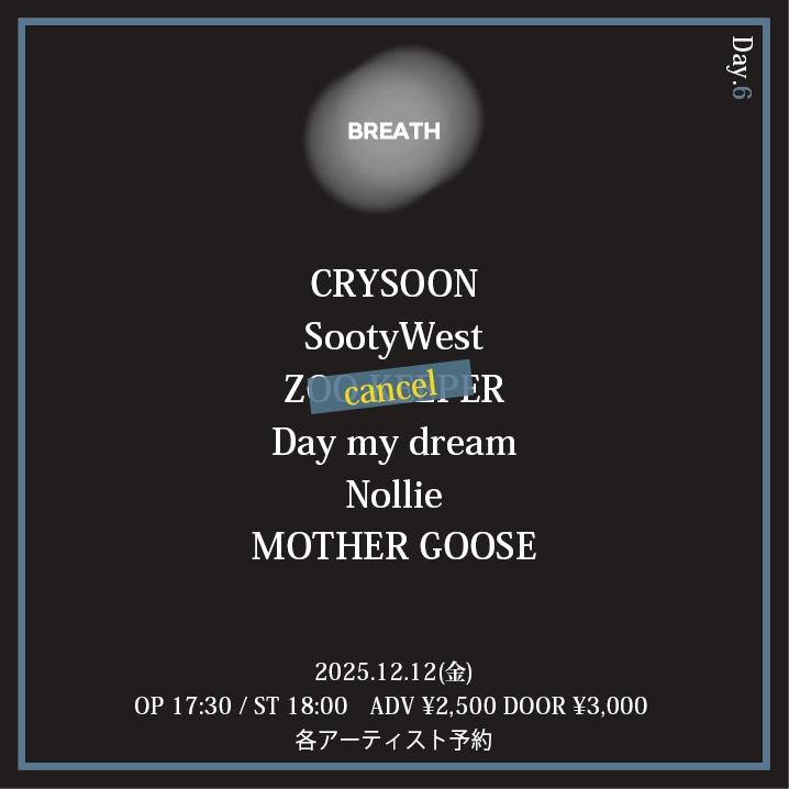 CRYSOON / SootyWest / Day my dream / Nollie / MOTHER GOOSE / ※ZOO KEEPERはキャンセルとなりました。
